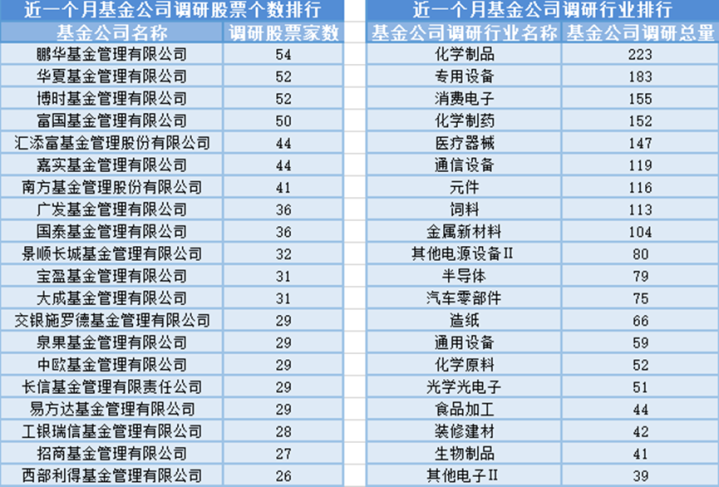 近一个月(7月20日-8月19日),鹏华基金参与公司调研的数量最多,共调研54家上市公司,然后调研较为活跃的还有华夏基金、博时基金和富国基金,分别调研52家、52家、50家上市公司;从调研行业上来看,基金公司对化学制品行业的上市公司调研次数最多,共有223次,其次是专用设备行业,基金公司调研了183次。