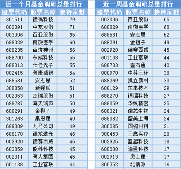 将时间周期缩短到最近一周(8月12日-8月19日)来看,基金调研数量第一的公司百亚股份,属于一次性个人卫生用品行业,主营业务为一次性个人卫生用品的研发、生产和销售。共被65家基金机构调研,然后被调研数量较多的股票是南微医学、安杰思和金橙子,分别接受60家、52家和49家基金机构的调研。